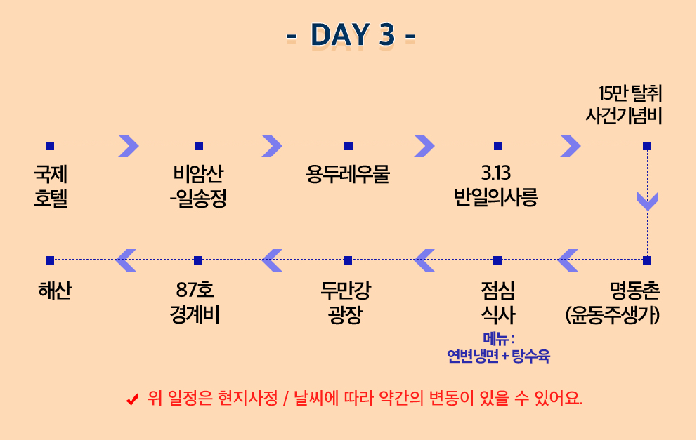 여행 일정은 계약 체결 시 예상하지 못한 부득이한 사정 등이 발생하는 경우 여행자의 사전 동의를 거쳐 변경될 수 있음을 양지하여 주시기 바랍니다.